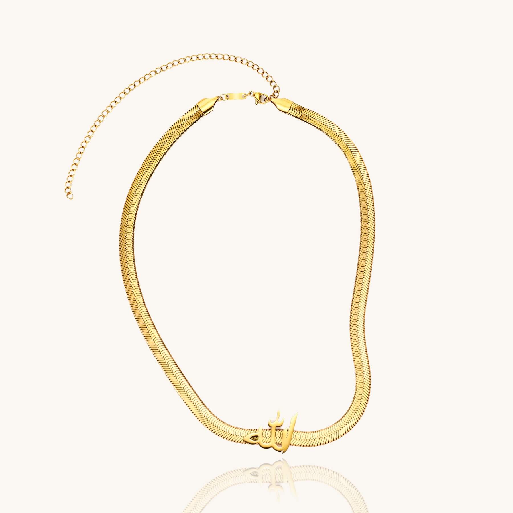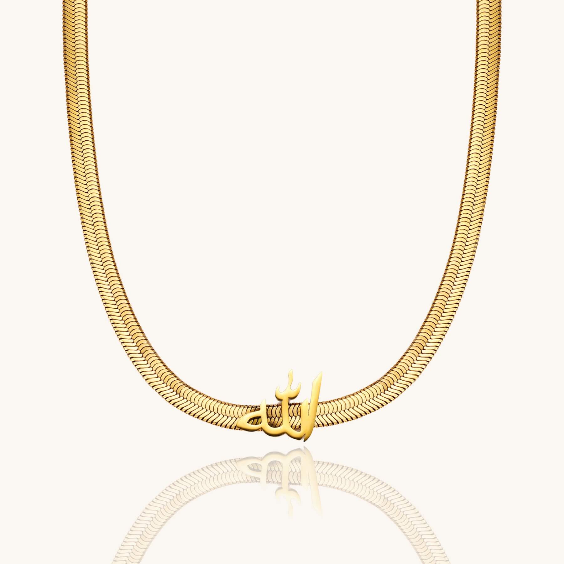 A bold piece that blends symbolism with style. This necklace features a sleek snake chain adorned with finely detailed Allah calligraphy, representing strength, protection, and faith.